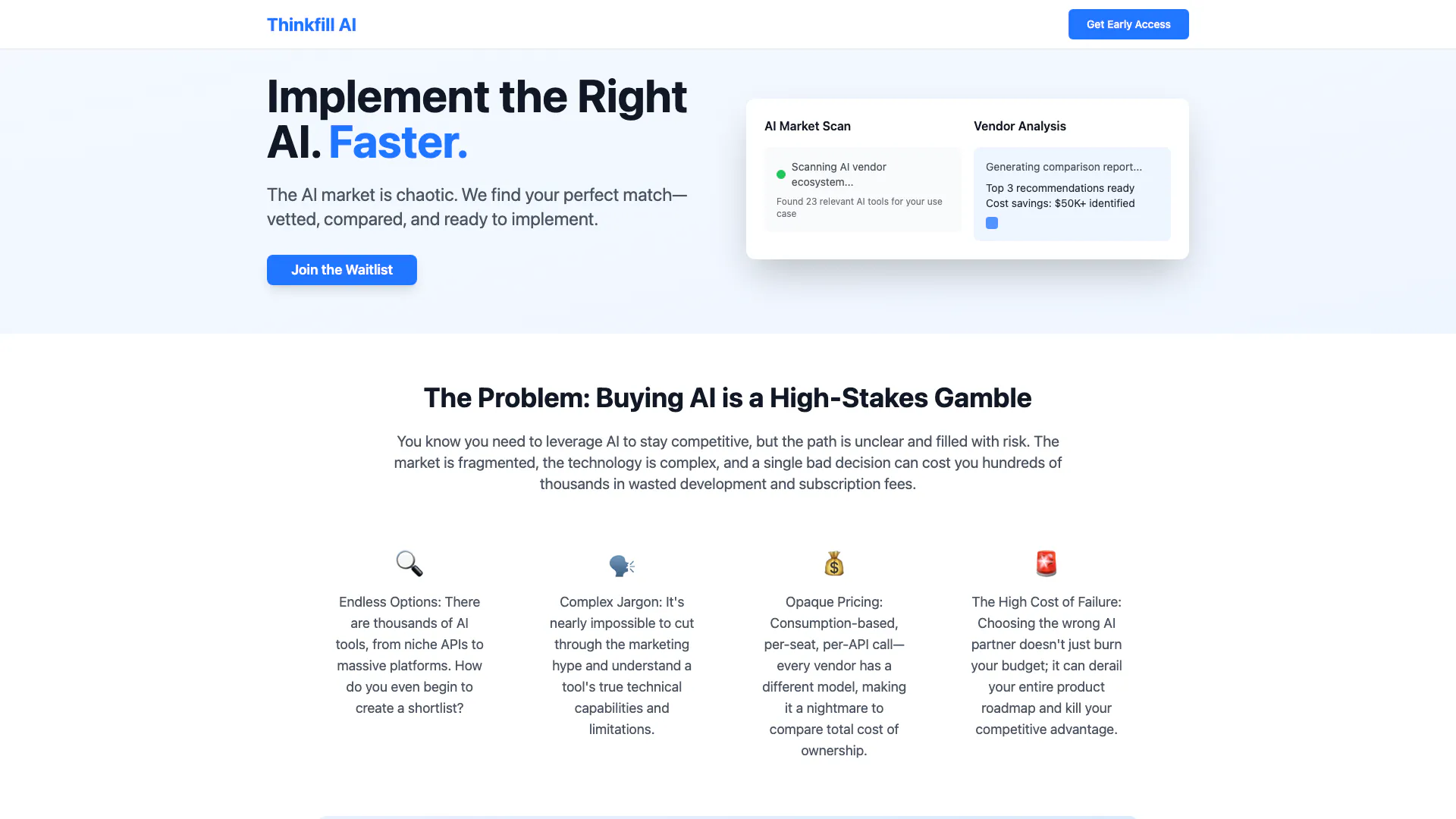 Thinkfill AI is a specialized platform designed to streamline the process of selecting the right AI vendors for businesses. In an increasingly chaotic AI market, Thinkfill AI cuts through the noise by providing a rigorous, AI-powered market analysis that identifies, vets, and compares the best AI solutions tailored to your specific needs. Within just 10 days, users receive a shortlist of the top three vetted recommendations, significantly reducing the time and risk associated with AI vendor selection[1]. This innovative tool empowers businesses to make informed decisions, ensuring that they leverage AI effectively to maintain a competitive edge.