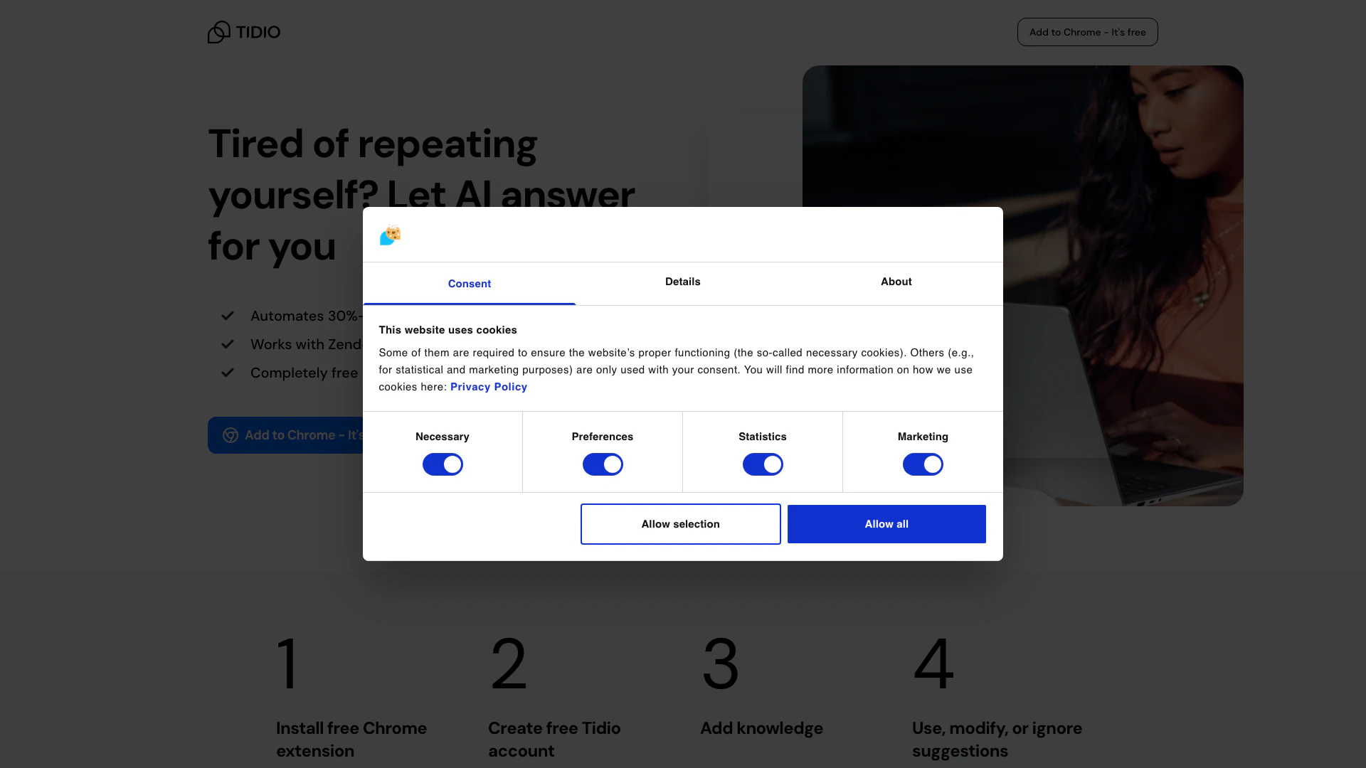 - Install the free Tidio Chrome extension from the Chrome Web Store.