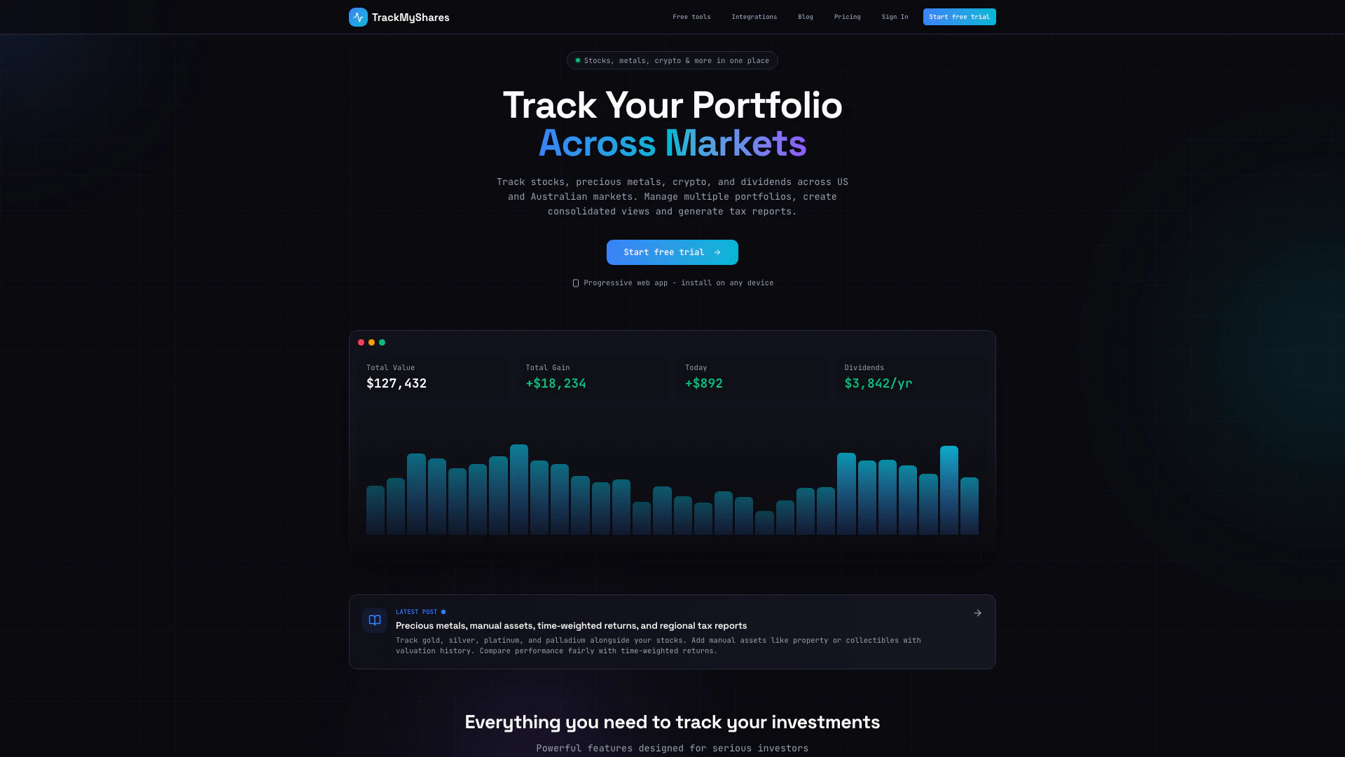- Comprehensive Portfolio Tracking: Track stocks, precious metals, crypto, and dividends across US and Australian markets with real-time price updates.