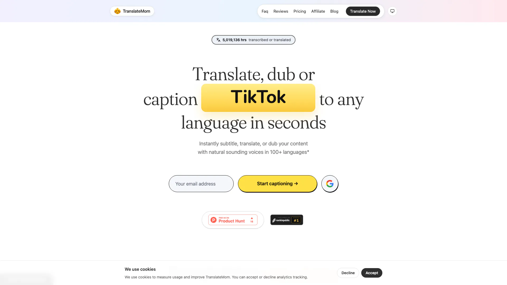 TranslateMom is a versatile online tool designed to help users translate and subtitle various types of media content, including YouTube videos, podcasts, Twitter posts, and TikTok videos. With its advanced AI technology, TranslateMom can quickly and accurately translate content into over 100 languages, providing users with natural-sounding voices for dubbing and subtitles. This tool is ideal for content creators, educators, and businesses looking to reach a global audience by breaking down language barriers.