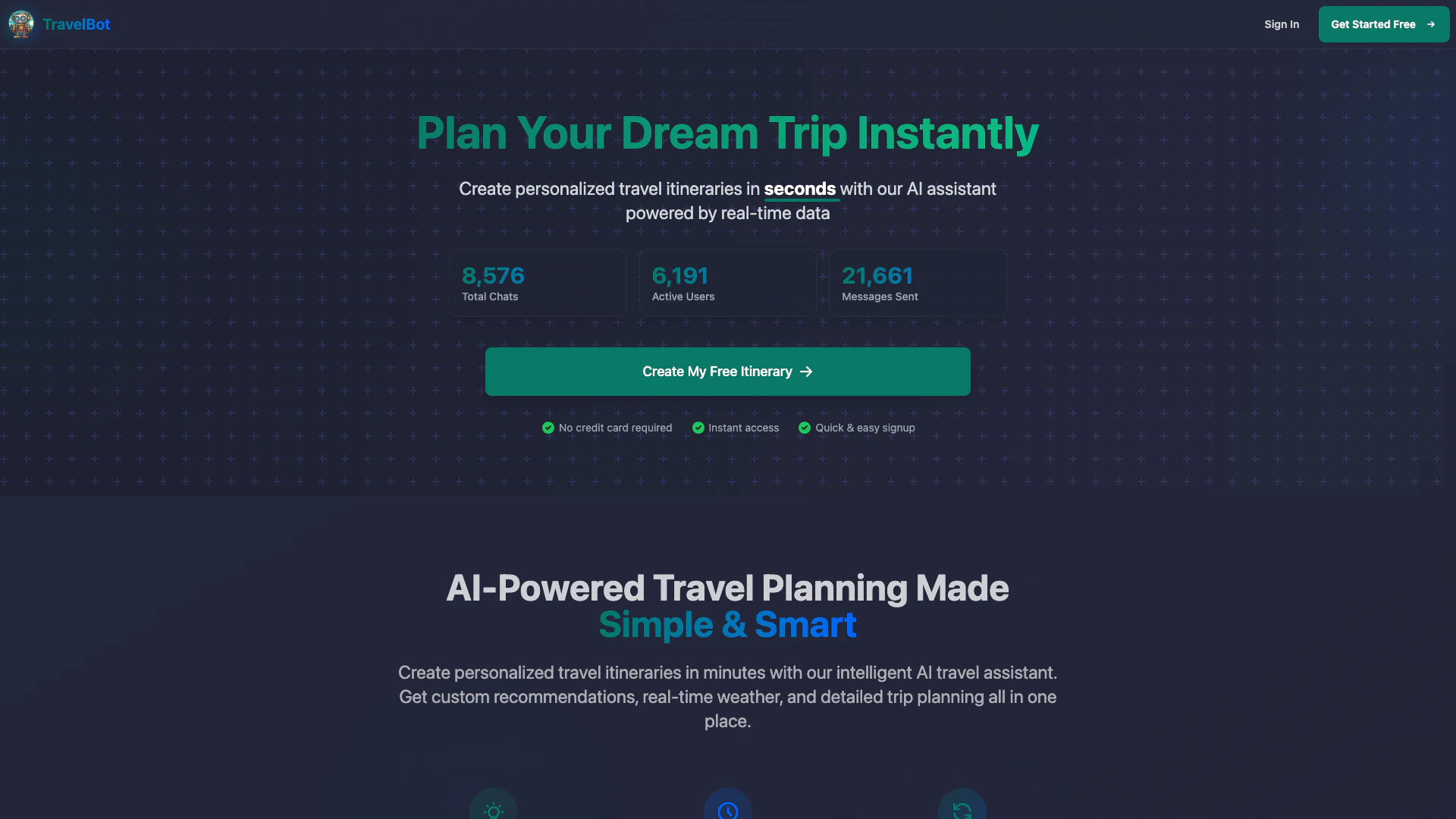 Travelbot is an AI-powered travel assistant designed to help users plan their perfect trips effortlessly. It generates personalized itineraries in seconds, providing real-time weather updates and smart recommendations for over 5,000 destinations worldwide. By utilizing advanced machine learning algorithms, Travelbot tailors travel plans based on individual preferences, budgets, and travel styles, ensuring that every traveler can enjoy a unique and customized travel experience.