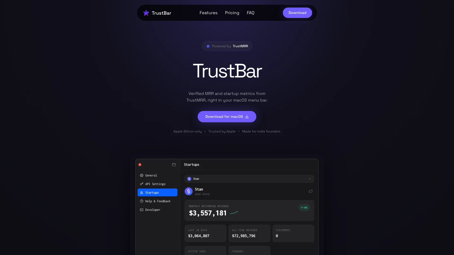 - Lightweight and Accessible: TrustBar is a lightweight macOS menu bar application, providing quick access to verified MRR and startup metrics with just one click.