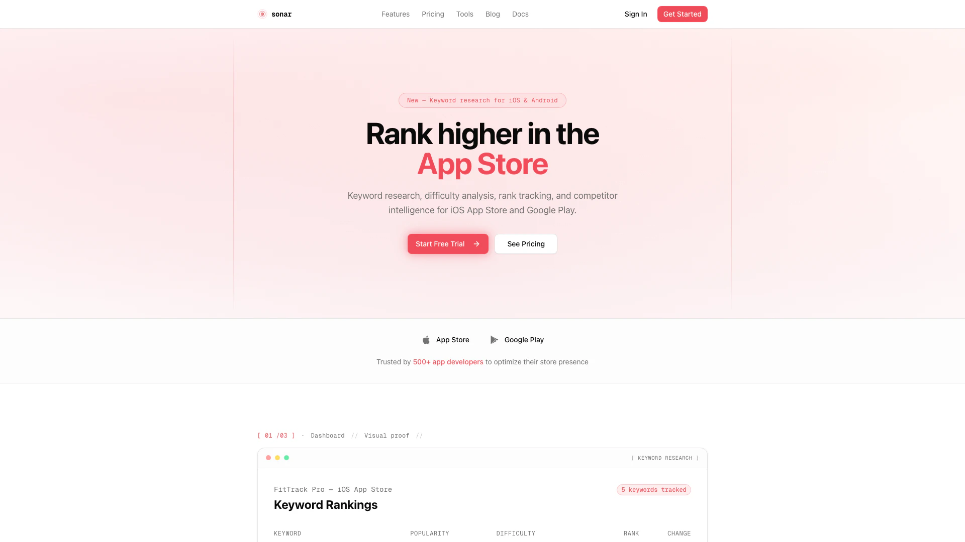 Trysonar is an advanced keyword research and app store optimization (ASO) tool designed specifically for the iOS App Store and Google Play. It provides comprehensive features such as keyword research, difficulty analysis, rank tracking, and competitor intelligence, enabling app developers to enhance their visibility and rankings in app stores. With Trysonar, users can discover untapped keywords, monitor their app's performance, and gain insights into competitors' strategies, all from a single, user-friendly dashboard.