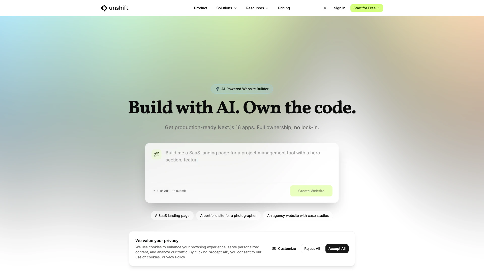 Unshiftai offers full code ownership, allowing developers to export clean, production-ready Next.js 16 code without any lock-in. It combines AI generation with a visual builder, providing flexibility and control over the development process.