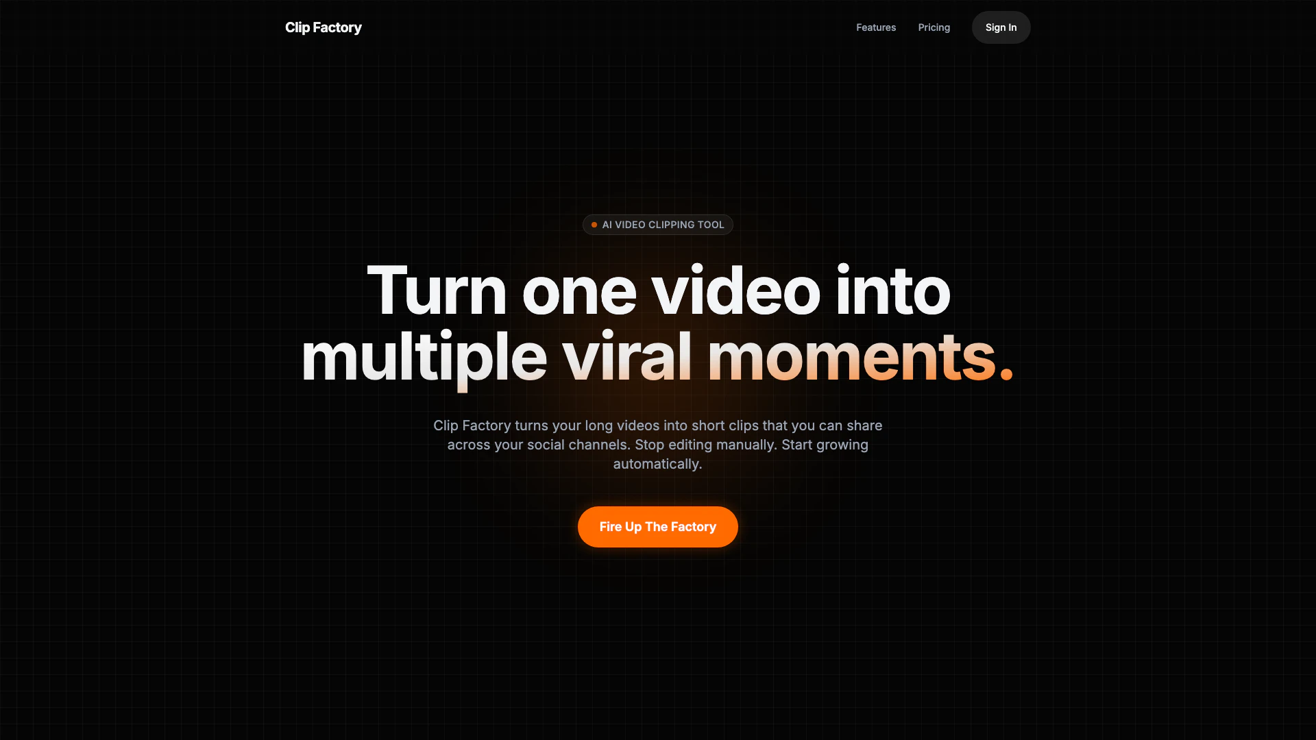 Clip Factory is a tool that helps video creators quickly find the most interesting parts of their long videos and turn them into short, shareable clips for social media. Just upload your video, and our AI will automatically create a short, shareable clip for you.