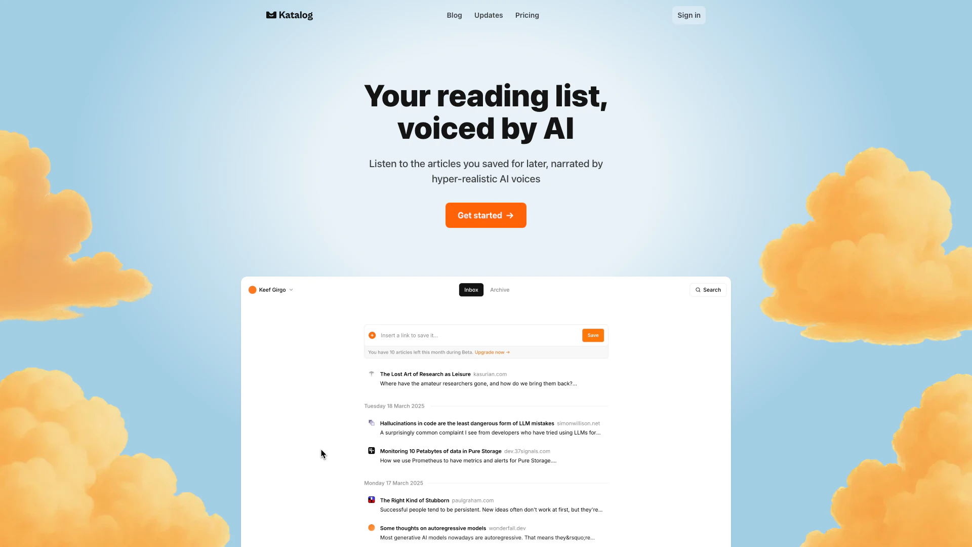 Yes, Katalog is live. Pick the Basic or Pro plan and you can begin saving articles right away, with two complimentary audio generations to help you try the listening experience.