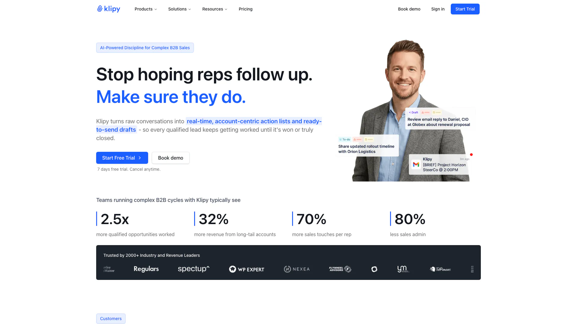 Klipy is primarily designed for B2B sales teams, including sales leaders, account executives, and revenue operations professionals. It is ideal for organizations that manage complex sales cycles and require disciplined follow-up processes. Sales managers looking to improve team performance without increasing administrative burdens will find Klipy particularly beneficial, as it automates many routine tasks and ensures that every qualified lead receives the attention it needs.