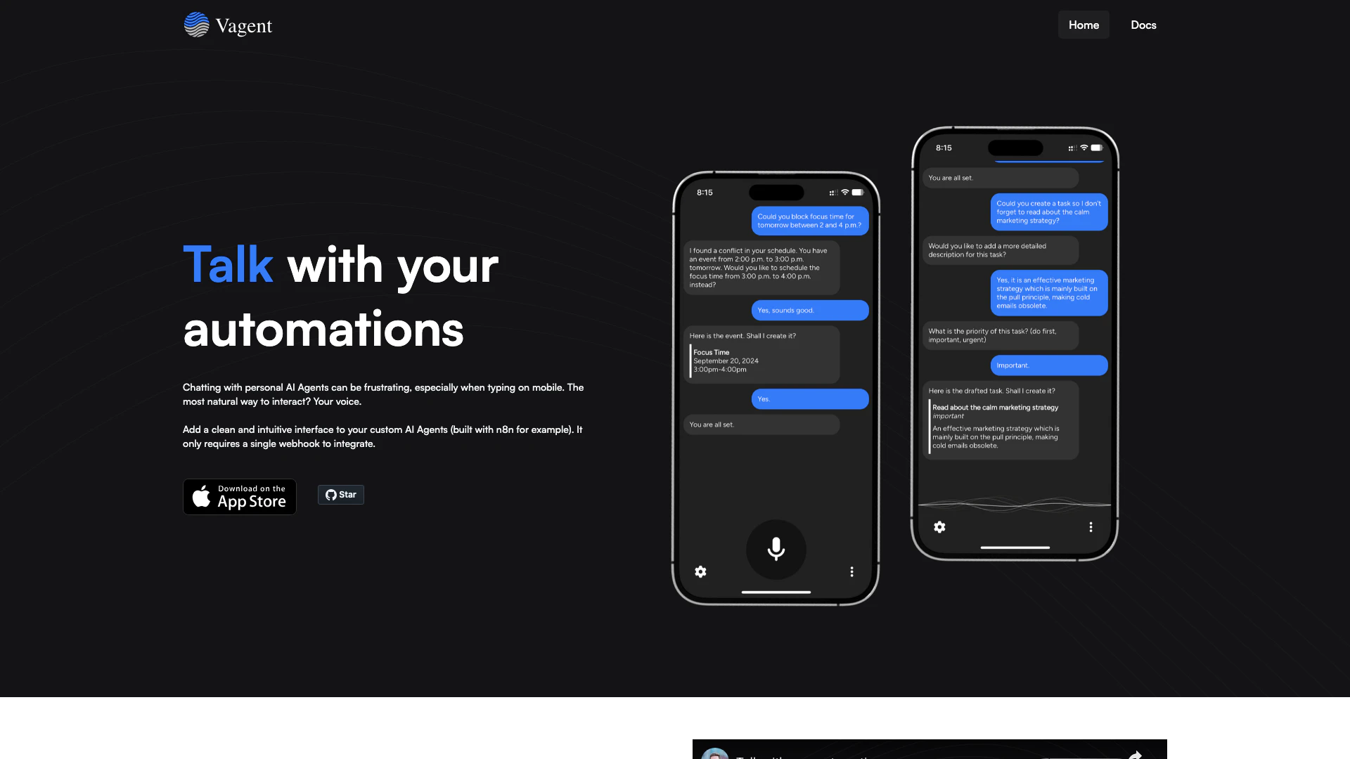 Vagent is an innovative tool designed to enhance the interaction with custom AI Agents by providing a clean and intuitive interface. It is particularly useful for automating conversations with AI, enabling users to communicate naturally using their voice. Built with flexibility in mind, Vagent integrates seamlessly with various backend systems using just a single webhook, making it an accessible solution for developers and users alike.