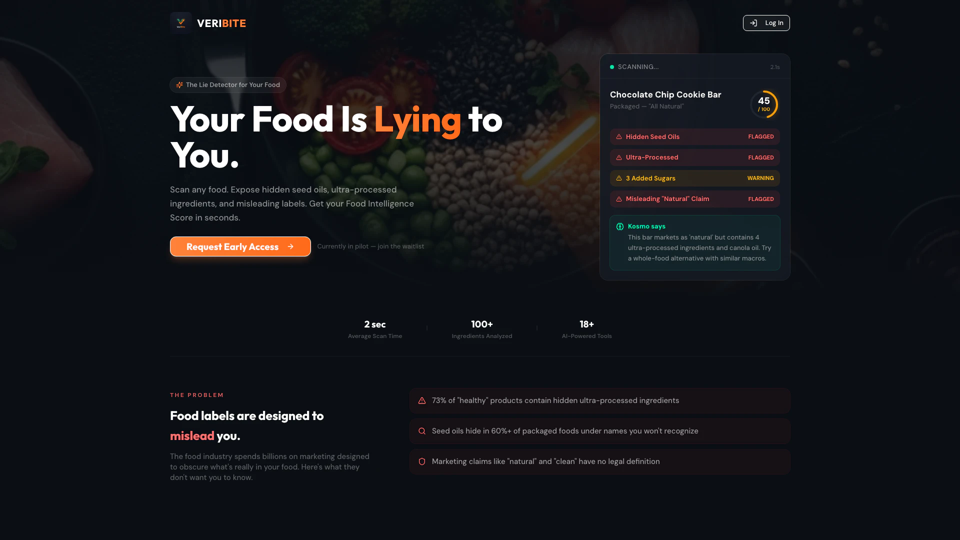 - Food Truth Radar: Quickly scans and grades food items on a 0-100 Food Intelligence Score, identifying hidden ingredients.