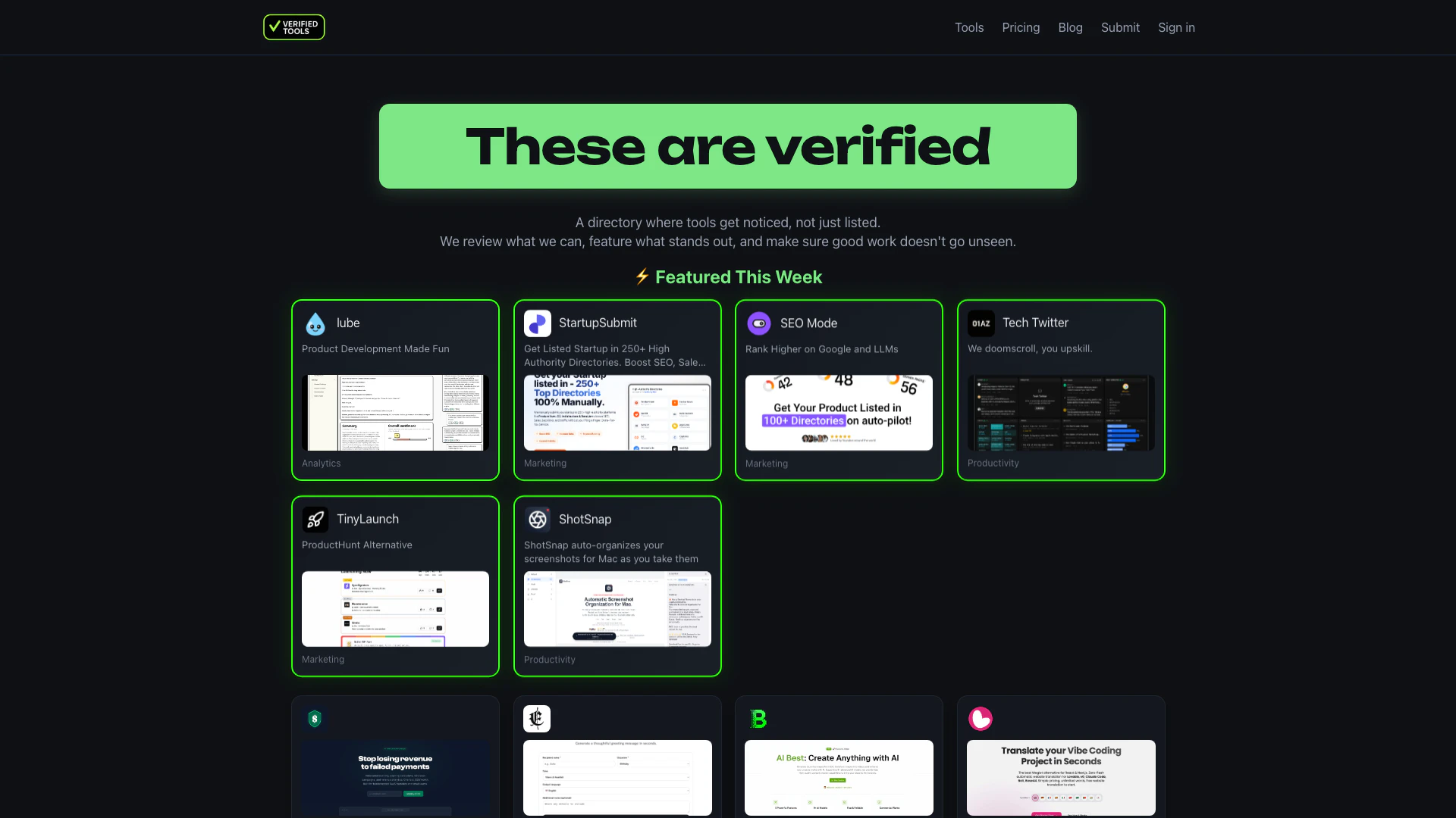 Verifiedtools is an innovative online directory[1] designed to help tools gain visibility and recognition in a crowded marketplace. Unlike traditional directories that simply list tools, Verifiedtools focuses on reviewing and featuring standout products, ensuring that high-quality tools do not go unnoticed. This platform serves as a valuable resource for users looking for trusted tools[3] while providing creators with a stage to showcase their work.