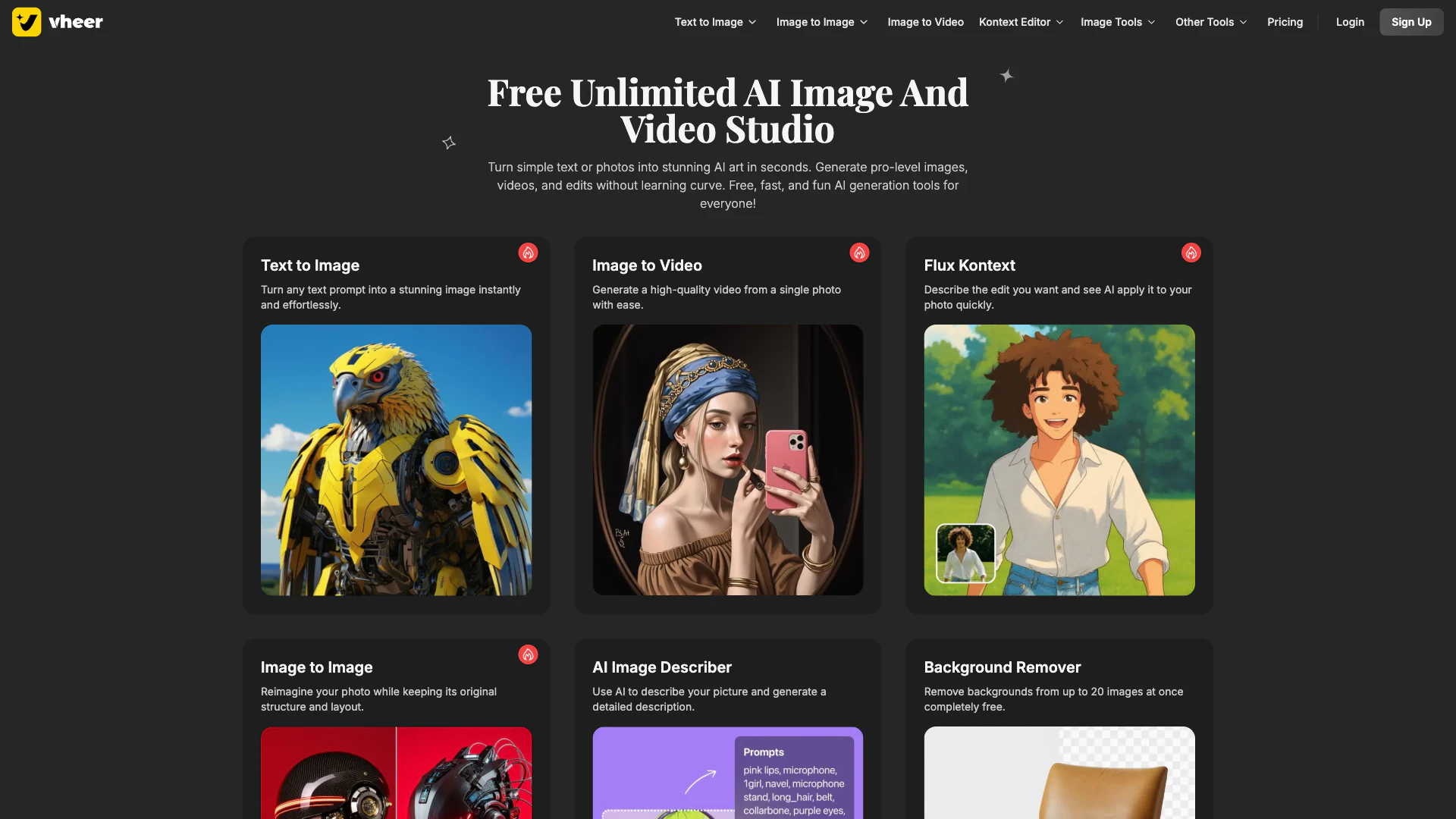 Vheer AI is a free AI platform that lets you generate images from text, turn photos into videos, and edit pictures with AI-powered tools. It also includes features to enhance image quality with one click, helping anyone create professional visuals quickly and easily.
