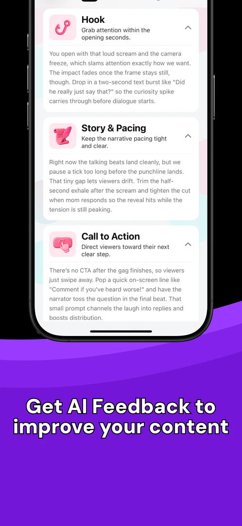 - Tailored Actionable Feedback: The app offers tailored feedback on hooks, audio, pacing, and visuals, enabling users to enhance viewer retention and engagement.