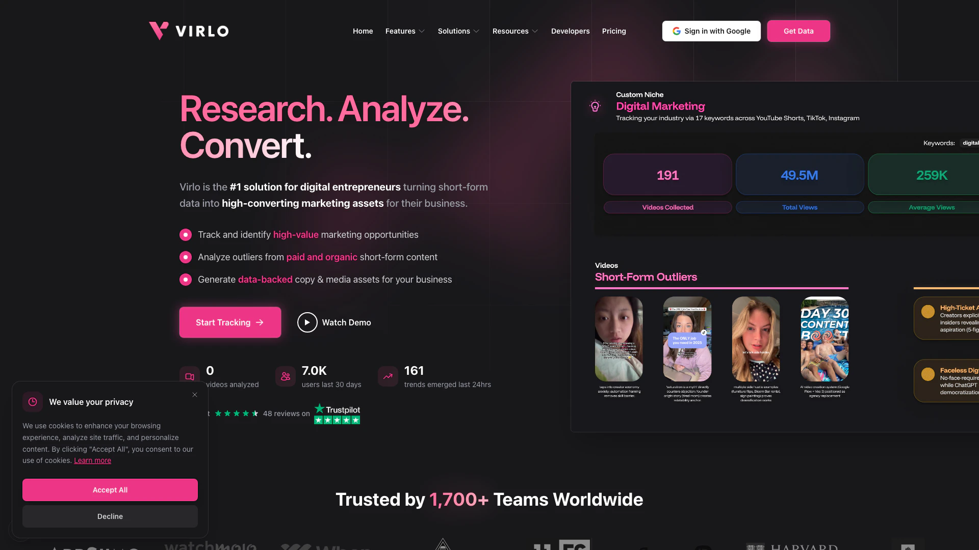 Virlo is a data aggregation and creator tooling platform for short-form video. Our mission is to help those who make money by leveraging short-form content make it faster. Why is this valuable? Virlo firmly believes that it's now more important than ever for anyone who makes money online to be aware of what's happening across short-form niches and trends. The faster you can be in the know on viral hooks, niches, and trends, the faster you can make money off of them.