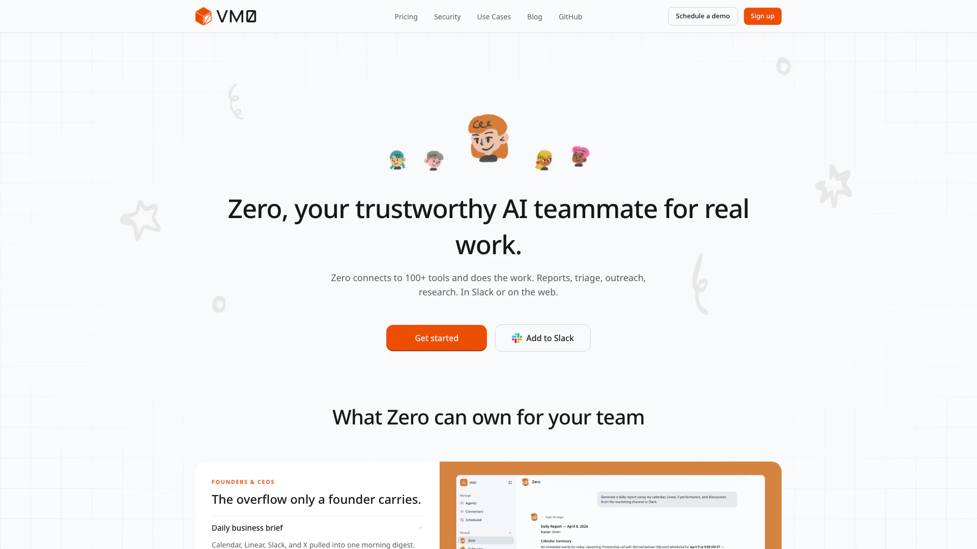 Vm0ai, also known as Zero, is an innovative AI tool designed to serve as a reliable teammate for real work. It seamlessly connects to over 100 tools, enabling it to perform a variety of tasks including reporting, triage, outreach, and research directly within Slack or on the web. By integrating with essential applications like Gmail, Notion, and Linear, Vm0ai acts not just as a passive assistant but as an active collaborator, managing workflows and enhancing team productivity.