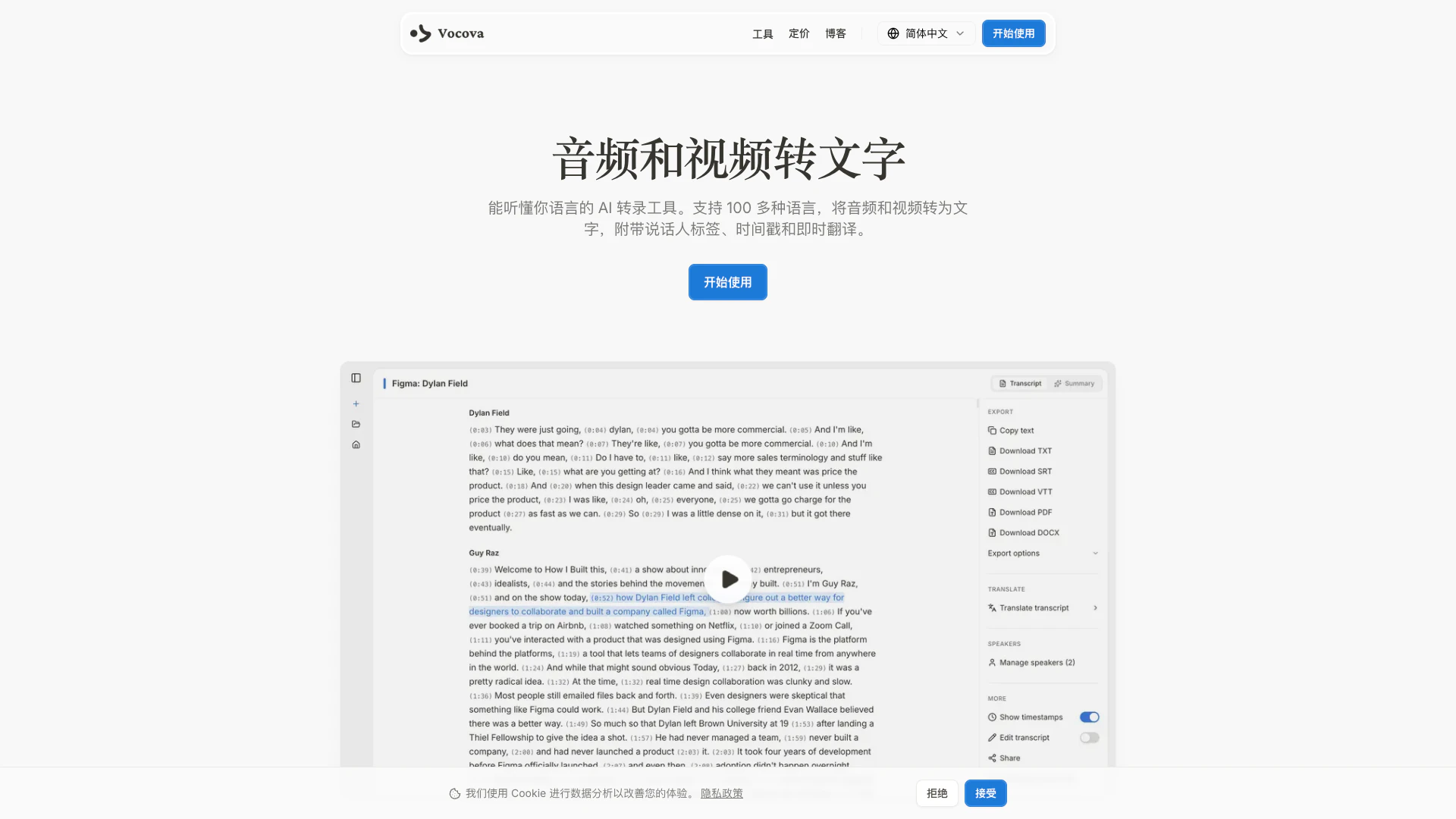 - Multi-language Support: Vocova supports transcription in over 100 languages, allowing users to work with diverse audio and video content.