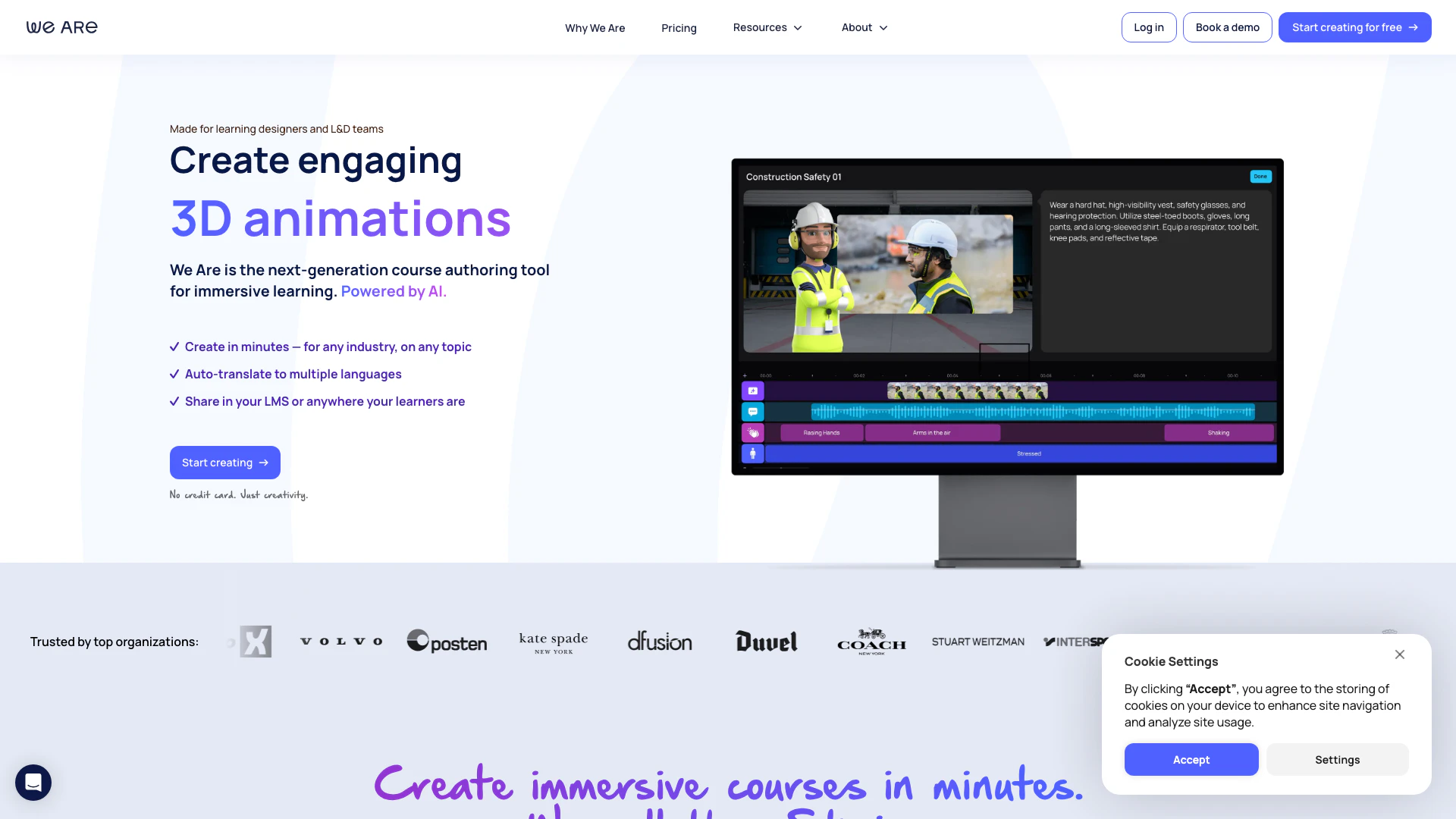 We Are Learning offers a variety of powerful features to enhance the creation of 3D animated videos and simulations, including: - AI-Powered Scriptwriting: Collaborate with an AI-copilot to build engaging narratives and interactive scenarios. - Customizable Characters and Scenes: Choose from a range of character options and backgrounds or upload your own to create unique learning experiences. - Interactive Elements: Incorporate dialogue, responses, and hotspots to make the learning experience more engaging and immersive. - Easy Animation Tools: No animation skills required; simply select gestures and facial expressions to bring characters to life. - LMS Integration: Seamlessly integrate with Learning Management Systems that support xAPI or SCORM for tracking and distribution.
