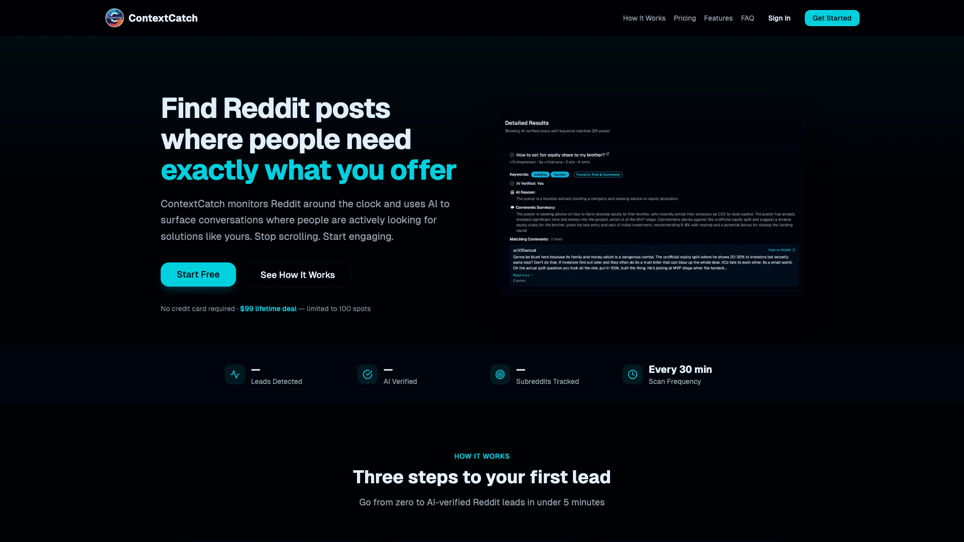 ContextCatch monitors Reddit continuously, using AI to surface conversations where users are actively looking for solutions that match your offerings. It scans posts every 30 minutes to ensure timely lead detection.