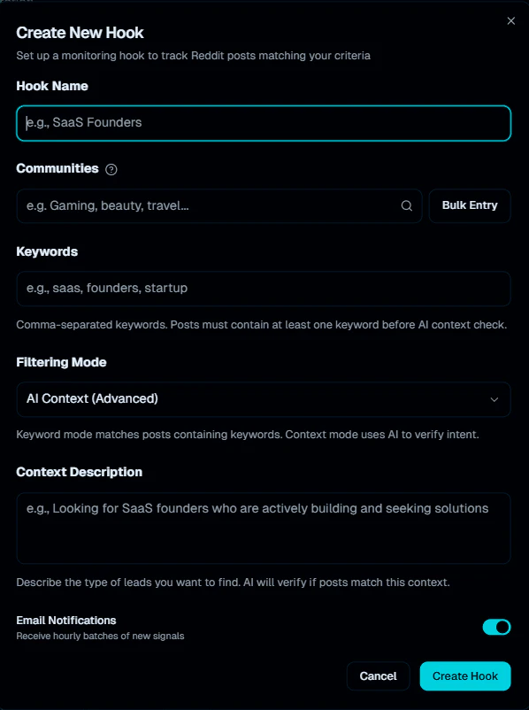 - Set Up Your Hook: Choose relevant subreddits, add specific keywords, and describe your ideal lead in simple terms. This setup takes less than 2 minutes.