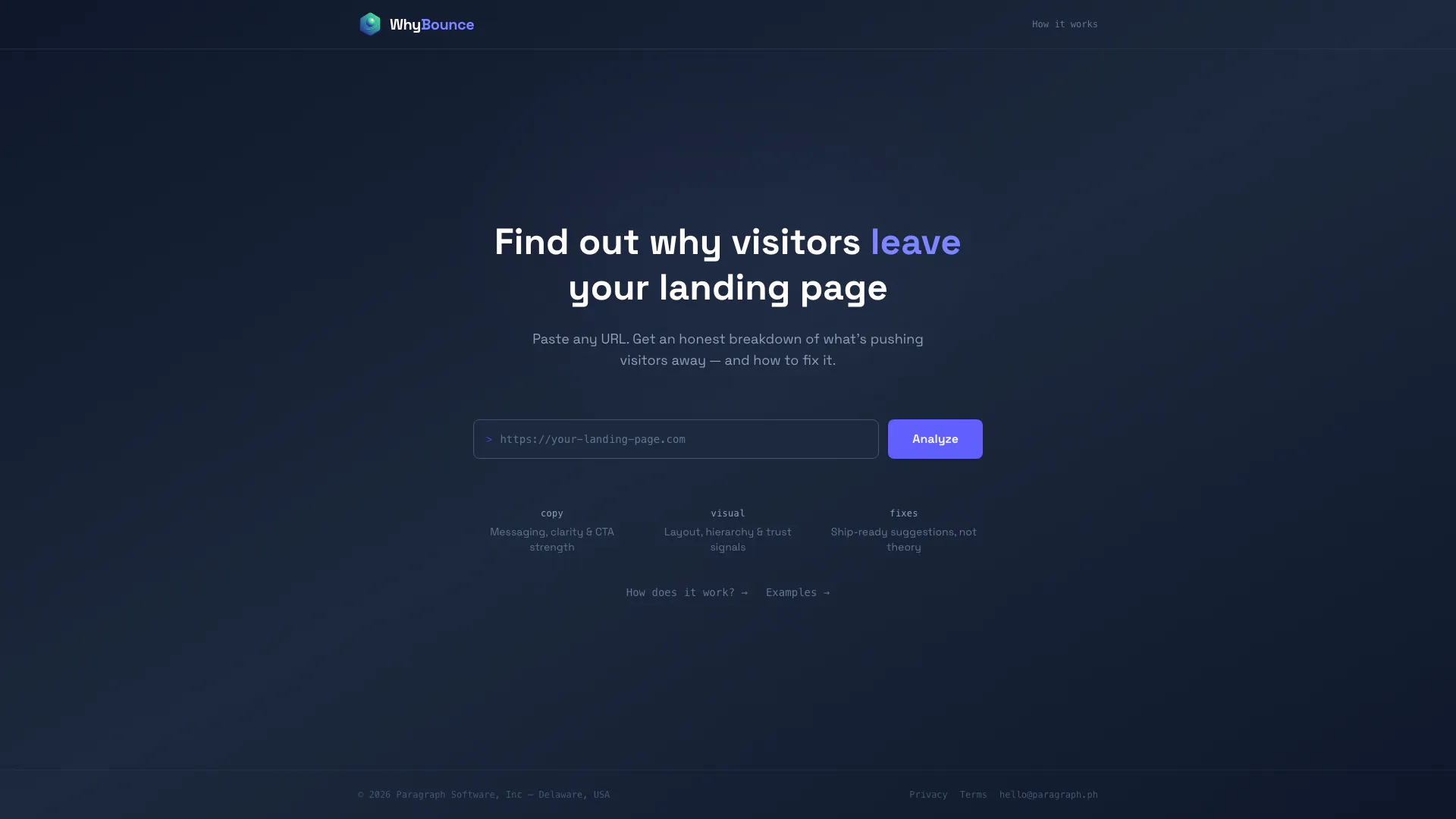 WhyBounce is an innovative AI tool designed to analyze landing page[2]s and provide users with a detailed audit of why visitors may be leaving. By simply pasting a URL, users receive a straightforward and honest breakdown of the elements that could be driving visitors away, along with actionable, copy-ready fixes that can be implemented to enhance page performance. This tool is particularly valuable for marketers, web developers, and business owners looking to optimize their online presence and improve conversion rates.