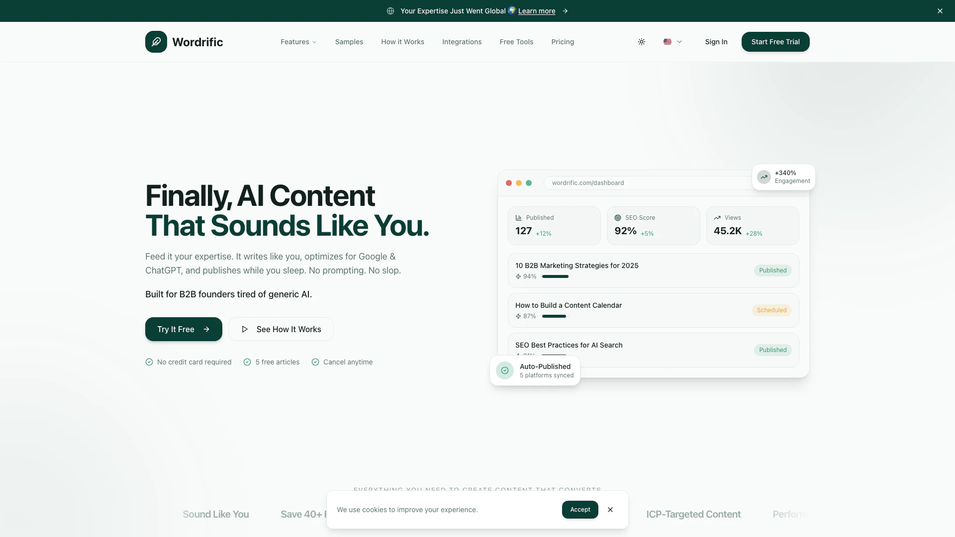 Wordrific is an AI-powered[1] content marketing[2] platform designed to transform your Ideal Customer Profile (ICP) research into SEO-optimized[3] articles that rank on major search engines like Google, as well as AI platforms like ChatGPT and Perplexity. It automates the publishing process for B2B content[5] teams, helping them achieve consistent pipeline growth without the need for manual intervention. With features that streamline content creation, optimization, and distribution, Wordrific enables businesses to produce high-quality, targeted content efficiently, allowing teams to focus on strategic growth rather than repetitive tasks.