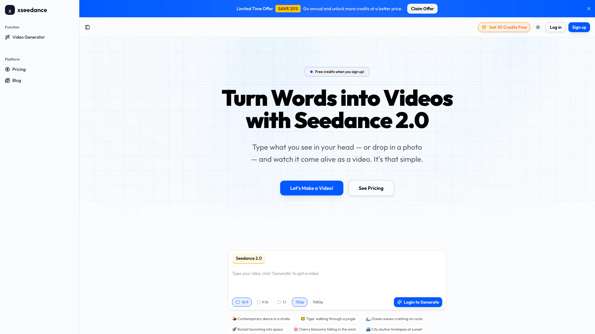 xseedance is an innovative AI-powered video generation tool that allows users to create stunning videos from text prompts or images without any prior video editing experience. Utilizing the advanced capabilities of Seedance 2.0, this tool automates the entire video creation process, enabling users to produce high-quality cinematic content quickly and effortlessly. Whether you're looking to create promotional videos, artistic visuals, or simply explore creative ideas, xseedance offers a user-friendly platform that transforms your concepts into real videos.
