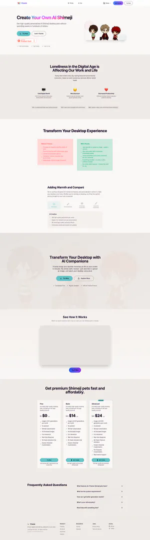 YCamie is an innovative tool that allows users to create high-quality personalized Shimeji desktop pets effortlessly. Unlike traditional customization methods that can take weeks and cost hundreds of dollars, YCamie simplifies the process, enabling users to bring their favorite characters to life on their screens in just minutes. With its intuitive interface, users can describe or upload images of their desired pets, transforming their desktop experience into a lively and interactive environment. YCamie aims to combat feelings of loneliness and burnout associated with prolonged screen time by adding a touch of joy and companionship to the user's workspace.