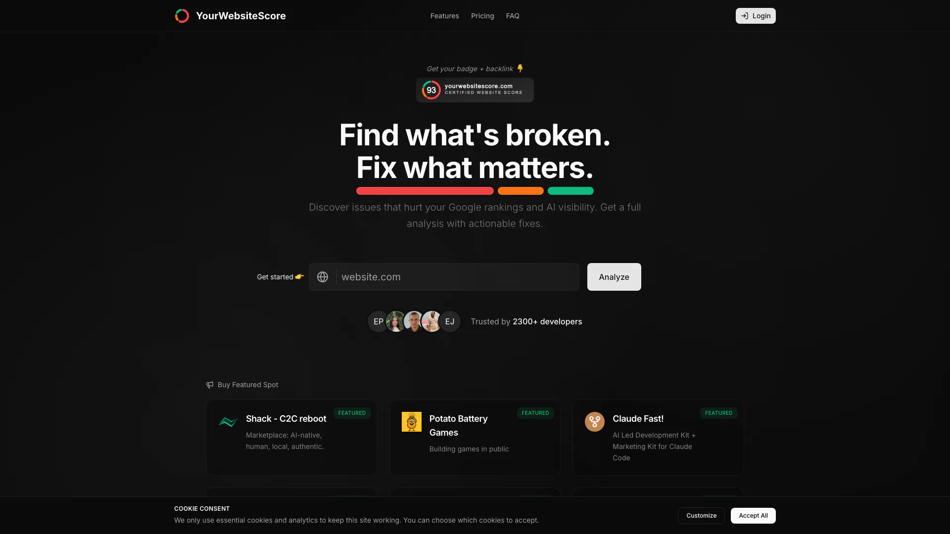 - Comprehensive Website Analysis: YourWebsiteScore provides deep analysis of your website, identifying hidden issues that affect speed, quality, trust, and SEO, along with actionable fixes.