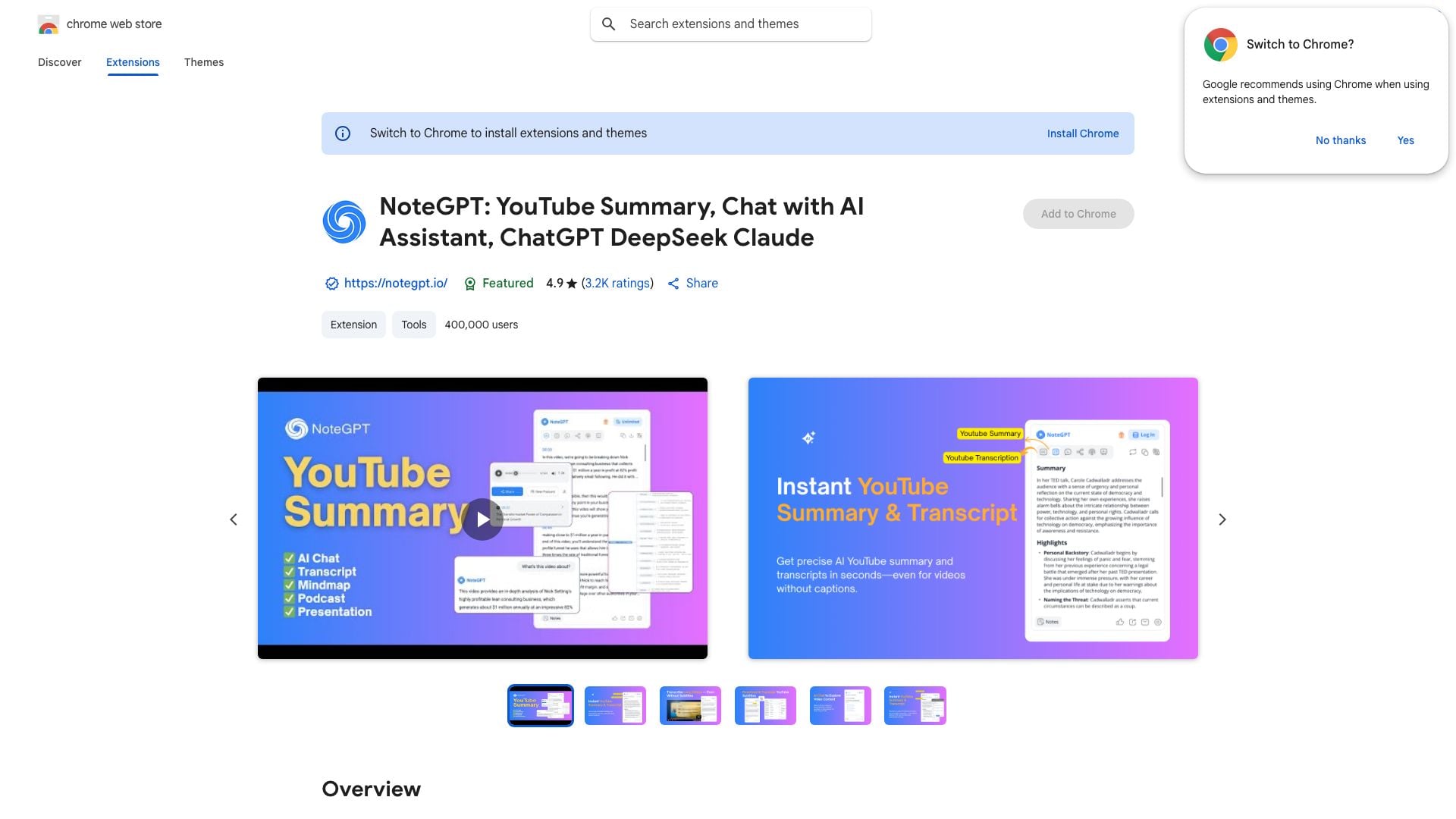 NoteGPT Extension is an AI-powered Chrome extension that helps you summarize, transcribe, and repurpose YouTube videos, webpages, and PDFs. It turns long-form content into structured notes, mind maps, slides, or podcasts — all in one click.