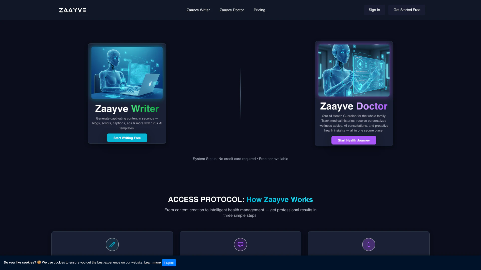- Select Module: Choose between Zaayve Writer for content generation[2] or Zaayve Doctor for health management[6].