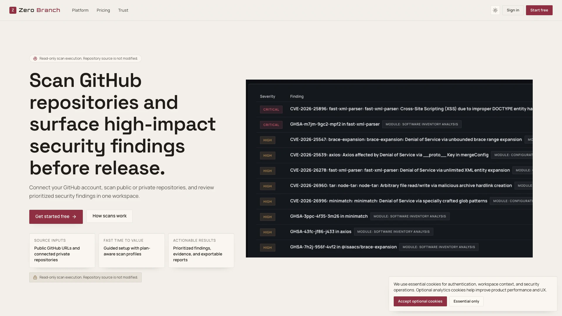 Zerobranch is a powerful tool designed to enhance security in software development by scanning GitHub repositories[1] for potential vulnerabilities. It allows users to connect their GitHub accounts and scan both public and private repositories, providing a centralized workspace to review prioritized security findings. With its focus on actionable results, Zerobranch helps teams identify high-impact security issues before they can affect software releases, ensuring a robust security posture for modern engineering organizations.