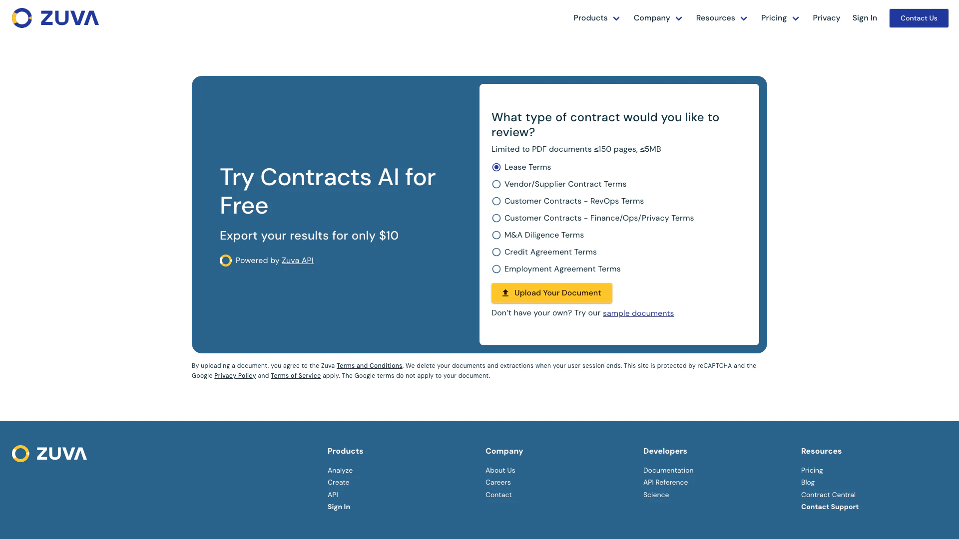 - Visit the Zuvaai website and navigate to the 'Try Contracts AI Free' section.